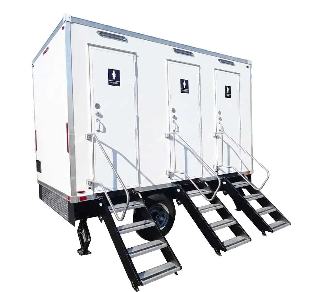 A VIP restroom trailer is a fully enclosed, climate-controlled unit with flushing toilets, running water sinks, LED lighting, mirrors, and finished interiors. It’s a fundamentally different experience from a standard portable restroom — comparable to an indoor restroom. Standard porta potties are self-contained units designed for construction sites and general use.